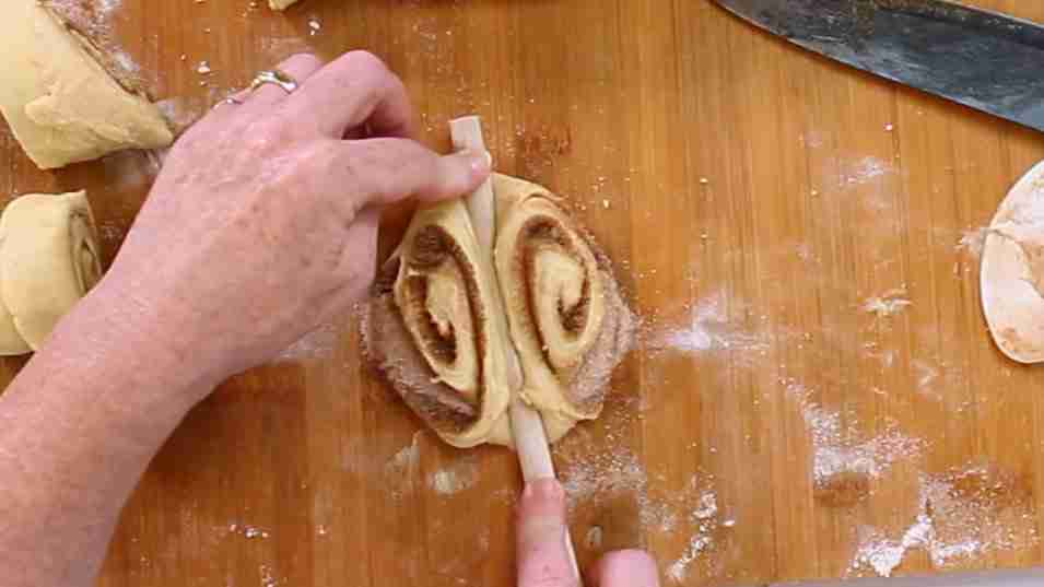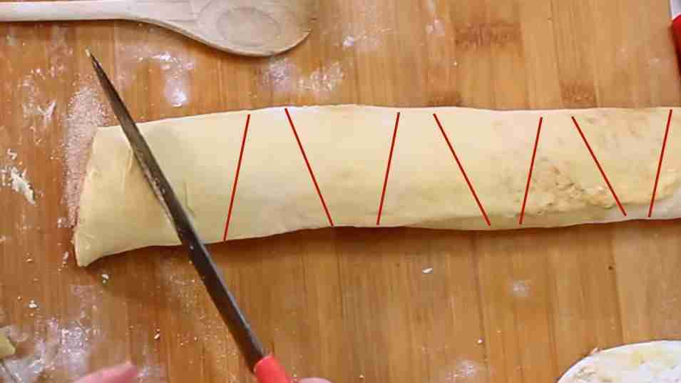 - Take a knife and cut the roll into slices 4 cm /1½'' wide. The best way to do this is cutting trapezoids that are almost rectangles (see video).Turn the short side of the trapezoid to the top, then press the handle of a wooden spoon into this end, pressing down almost all the way. This creates some sort of butterfly shape (see video).Place the shaped slices on a baking sheet.Cover and let rest in a warm place for 30 to 40 minutes or until the rolls have visibly increased in their size.